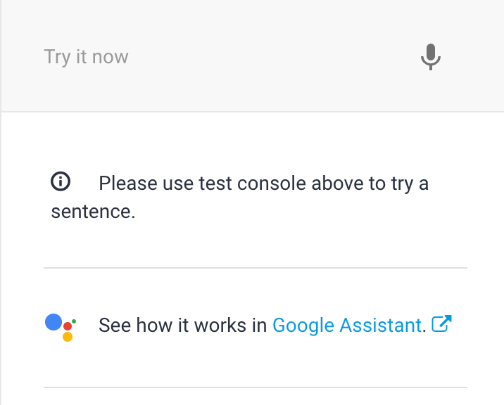 At this point, the Dialogflow should be set up. Test it in the Try it now panel on the right by entering the following conversation: